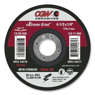 Loading product details...eXtreme Grind™ Type 27 Grinding Wheel, 5 in dia, 1/4 in thick, 5/8 in - 11 arbor, 24 Grit, Ceramic