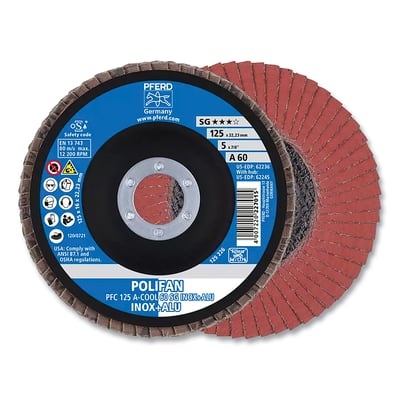 Loading product details...POLIFAN® Type 29 SG Flap Disc, 5 in dia, 60 Grit, 7/8 in Arbor dia, 12200 RPM, Aluminum Oxide A-Cool