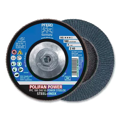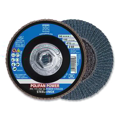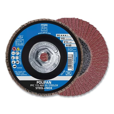 Loading product details...POLIFAN® Type 29 SG Flap Disc, 4-1/2 in dia, 60 Grit, 7/8 in Arbor dia, 13300 RPM, Aluminum Oxide A-Cool