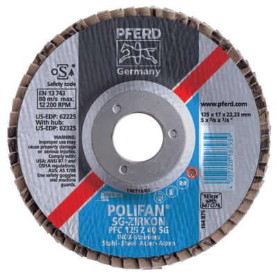 Loading product details...POLIFAN® Type 29 SG Flap Disc, 5 in dia, 40 Grit, 7/8 in Arbor dia, 12200 RPM, Zirconia Alumina Z