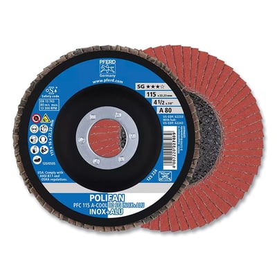 Loading product details...POLIFAN® Type 29 SG Flap Disc, 4-1/2 in dia, 80 Grit, 5/8 in-11 Threaded Arbor dia, 13300 RPM, Aluminum Oxide A-Cool