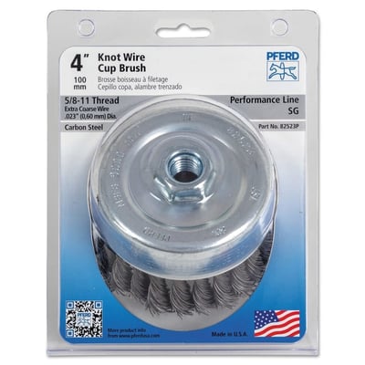 Loading product details...Standard Twist Single Row Cup Brush, 4 in dia, 5/8 in-11 Arbor, 0.023 Carbon Steel Wire