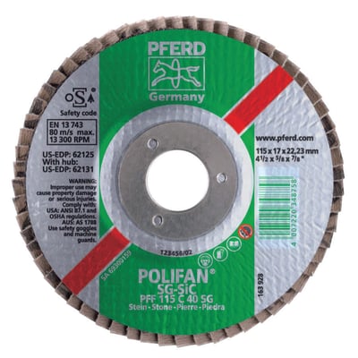Loading product details...Type 27 POLIFAN SG Flap Discs, 4 1/2', 40 Grit, 5/8 Arbor, 13,300 rpm, Zirconia