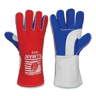 Loading product details...Stick Welding Gloves, 1075, Premium Side Split Cowhide Palm/BOH/Cuff, Lg, Red/Blue/Pearl, 14 in L Cuff